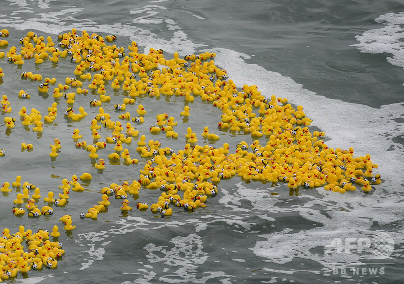 黄色いゴム製のアヒル2500個以上を埠頭(ふとう)から海に投下し、潮に乗って漂うアヒルが浜辺にたどり着く順番を競うという企画で、上位60位までのアヒルの持ち主に賞が授与される。優勝賞金は1000ドル(約10万8000円)。(c)AFP