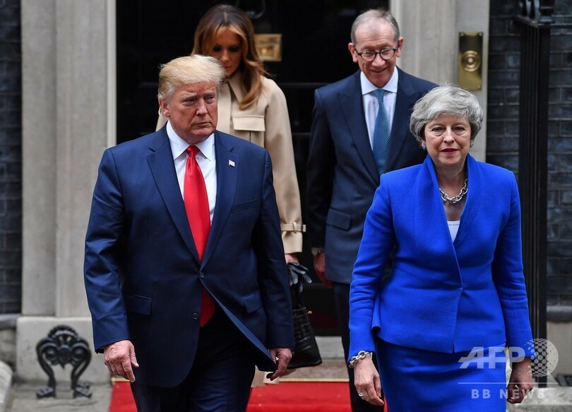 【6月5日 AFP】英国を訪問中のドナルド・トランプ(Donald Trump)米大統領は4日、辞任を表明しているテリーザ・メイ(Theresa May)英首相と会談し、欧州連合(EU)離脱(ブレグジット、Brexit)後に英国と「素晴らしい」貿易協定を結ぶと明言した。抗議デモや政治的混乱の中、ほころびを見せている英米の同盟関係を強化する狙いがある。