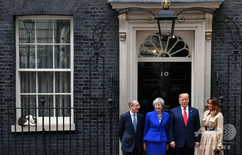 【6月5日 AFP】英ロンドン・ダウニング街(Downing Street)の首相官邸に住む猫のラリー(Larry)が4日、米英首脳会談のため官邸を訪れたドナルド・トランプ(Donald Trump)米大統領の専用車「ザ・ビースト(The Beast)」の下で座り込むハプニングがあった。テリーザ・メイ(Theresa May)英首相夫妻がトランプ夫妻を玄関前で出迎えた際には、ラリーが窓枠に座りくつろぐ姿も見られた。