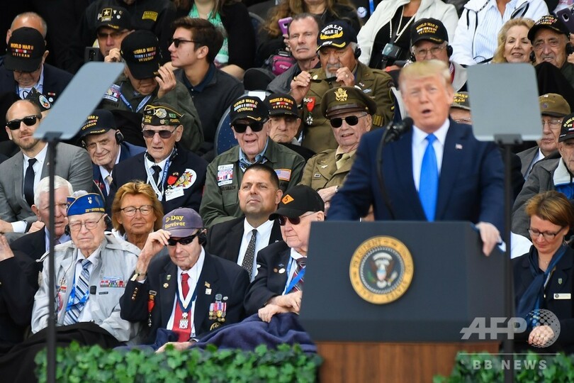 【6月6日 AFP】(更新、写真追加)フランス北西部ノルマンディー(Normandy)地方で6日、第2次世界大戦(World War II)のノルマンディー上陸作戦開始日「Dデー(D-Day)」から75年を記念する式典が開かれた。他の各国首脳と共に式典に出席したドナルド・トランプ(Donald Trump)米大統領は、米国との関係が揺らぐ同盟諸国に対し「われわれの絆は壊せない」と述べた。