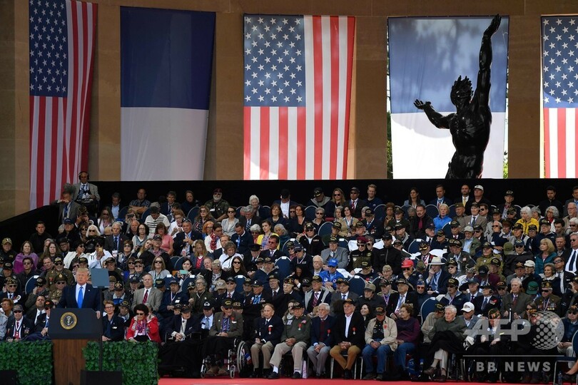 【6月6日 AFP】(更新、写真追加)フランス北西部ノルマンディー(Normandy)地方で6日、第2次世界大戦(World War II)のノルマンディー上陸作戦開始日「Dデー(D-Day)」から75年を記念する式典が開かれた。他の各国首脳と共に式典に出席したドナルド・トランプ(Donald Trump)米大統領は、米国との関係が揺らぐ同盟諸国に対し「われわれの絆は壊せない」と述べた。