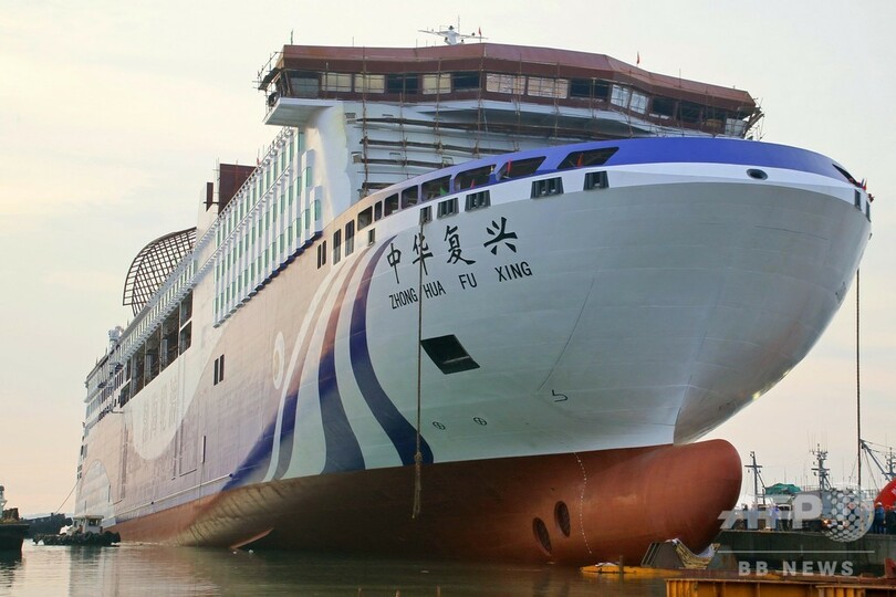 「中華復興」号の全長は212メートル、総重量4万4200トンで、乗客定員は1689人。船内には3層の駐車場が設置され、大小約350台の自動車を搭載することができる。正式投入後は、アジア最大重量、最大積載能力をもつ豪華客船となる。(c)CNS/JCM/AFPBB News