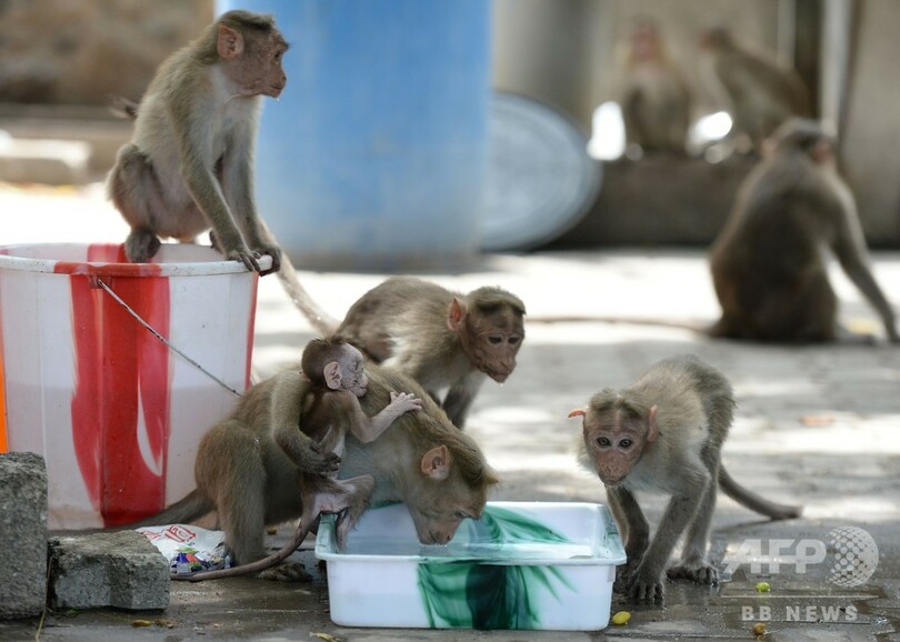 【6月11日 AFP】インド・チェンナイ(Chennai)にあるギンディー・チルドレンズパーク(Guindy Children's Park)で10日、暑いさなかサルたちが、ジュースや水を飲んで喉の渇きを癒やしたり、段ボールに入って日差しから逃れたりしていた。(c)AFP