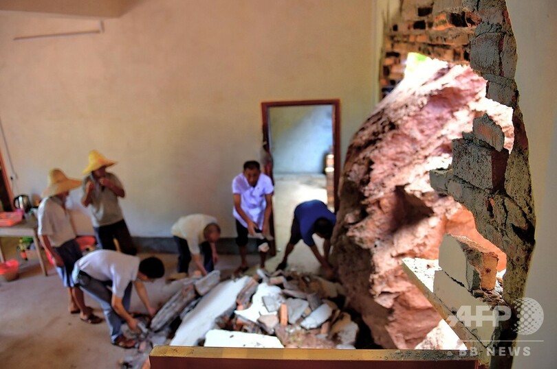 事前に避難していたこともあり、死傷者は出ていない。地元の村民らが協力し、岩の撤去作業などを行っている。(c)CNS/JCM/AFPBB News