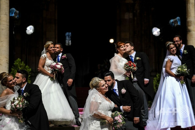 16組のカップルは、まず5組が民事婚を挙げ、それから全員で市庁舎のバルコニーに出て、歓声を上げる群衆に手を振ってあいさつした。その後、11組はビンテージカーで坂を上って約650メートル離れた旧市街アルファマ(Alfama)地区の入り口にある大聖堂へと移動し、挙式した。(c)AFP
