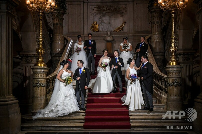 16組のカップルは、まず5組が民事婚を挙げ、それから全員で市庁舎のバルコニーに出て、歓声を上げる群衆に手を振ってあいさつした。その後、11組はビンテージカーで坂を上って約650メートル離れた旧市街アルファマ(Alfama)地区の入り口にある大聖堂へと移動し、挙式した。(c)AFP