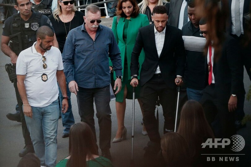 世界最高額選手であるネイマールは、警官に付き添われながら警備態勢が強化されたブラジル・サンパウロ(Sao Paulo)の警察署に出頭。先週行われたカタールとの国際親善試合で右足首を負傷し、コパ・アメリカ(2019 Copa America)欠場を強いられることになったネイマールは、黒っぽいスーツに身を包み、松葉づえをつきながら署内に入った。
