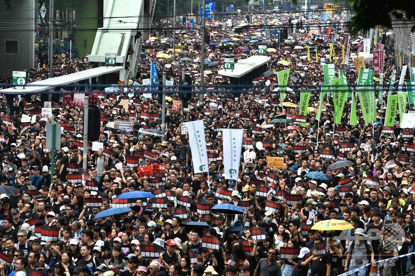 【6月16日 AFP】(更新)デモ隊と警官隊の間で異例の衝突が発生した香港で16日、中国本土への犯罪容疑者の引き渡しを可能にする「逃亡犯条例」をめぐり、数万人規模の新たなデモが決行された。15日には香港の行政トップが同条例の改正を延期すると譲歩したにもかかわらず、住民たちの怒りは収まっていない。