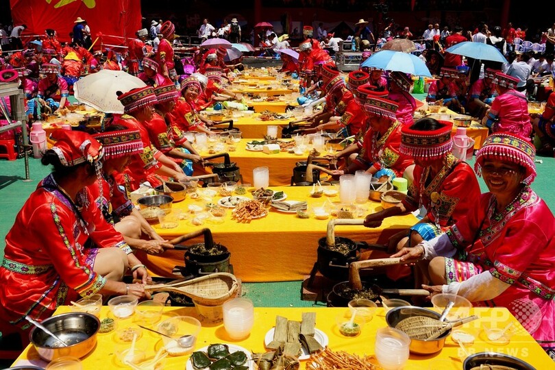【7月16日 CNS】中国・広西チワン族自治区(Guangxi Zhuang Autonomous Region)桂林市(Guilin)恭城ヤオ族自治県(Gongcheng Yao Autonomous County)油茶(Youcha)小鎮で先月、2019人のヤオ族が集い、当地特産の「油茶の実(アブラツバキ)」を、30分以内に同時にすりつぶし、鍋で煮た汁を同時に鍋から器に注ぐという「油茶飲料最多人数同時製造」というタイトルでギネス世界記録(Guinness World Records)の認定を受けた。(c)CNS/JCM/AFPBB News