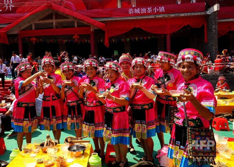 【7月16日 CNS】中国・広西チワン族自治区(Guangxi Zhuang Autonomous Region)桂林市(Guilin)恭城ヤオ族自治県(Gongcheng Yao Autonomous County)油茶(Youcha)小鎮で先月、2019人のヤオ族が集い、当地特産の「油茶の実(アブラツバキ)」を、30分以内に同時にすりつぶし、鍋で煮た汁を同時に鍋から器に注ぐという「油茶飲料最多人数同時製造」というタイトルでギネス世界記録(Guinness World Records)の認定を受けた。(c)CNS/JCM/AFPBB News