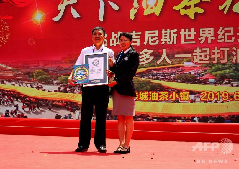 【7月16日 CNS】中国・広西チワン族自治区(Guangxi Zhuang Autonomous Region)桂林市(Guilin)恭城ヤオ族自治県(Gongcheng Yao Autonomous County)油茶(Youcha)小鎮で先月、2019人のヤオ族が集い、当地特産の「油茶の実(アブラツバキ)」を、30分以内に同時にすりつぶし、鍋で煮た汁を同時に鍋から器に注ぐという「油茶飲料最多人数同時製造」というタイトルでギネス世界記録(Guinness World Records)の認定を受けた。(c)CNS/JCM/AFPBB News