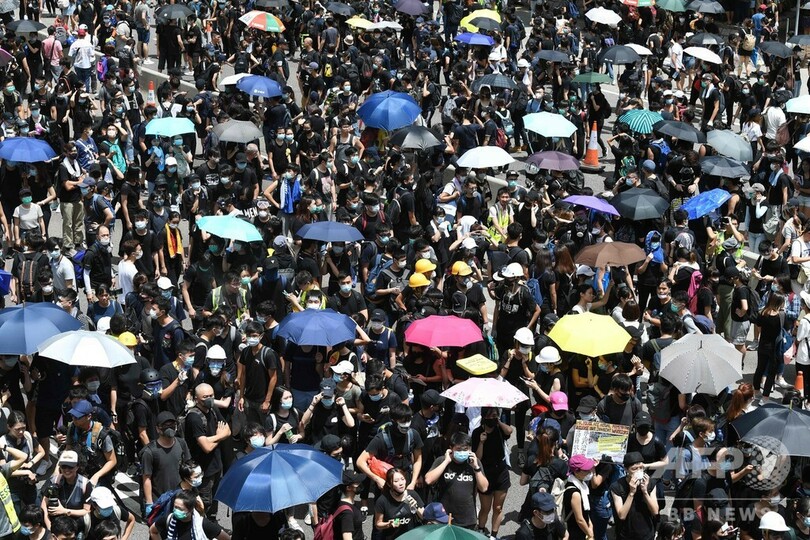 【6月21日 AFP】(更新、写真追加)香港では21日、中国本土への容疑者引き渡しを可能にする「逃亡犯条例」改正案の完全撤回と親中派の林鄭月娥(キャリー・ラム、Carrie Lam)行政長官の辞任を求め、数千人のデモ隊が幹線道路を埋め尽くした。