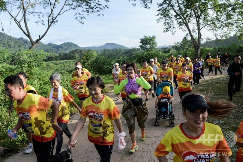 【6月23日 AFP】タイ北部チェンライ(Chiang Rai)県タムルアン(Tham Luang)で、地元サッカーチームの少年たちとコーチが洞窟に閉じ込められた日からちょうど1年となった23日、無事救出されたコーチと少年らが主導したチャリティーレースが洞窟の近くで開催された。