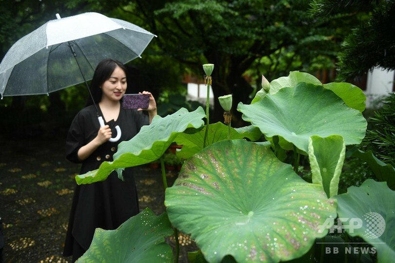 【6月24日 CNS】中国・浙江省(Zhejiang)杭州市(Hangzhou)西湖(West Lake)で、千年も昔の北宋時代のハスの実から、緑の葉と花のつぼみが元気に大きく育ち、市民と観光客の目を楽しませている。(c)CNS/JCM/AFPBB News
