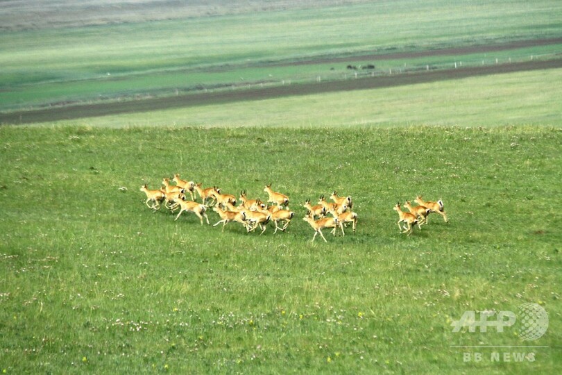 祁連山の生態環境の改善などによって、レイヨウの一種モウコガゼルの群れも徐々に拡大しつつある。(c)CNS/JCM/AFPBB News