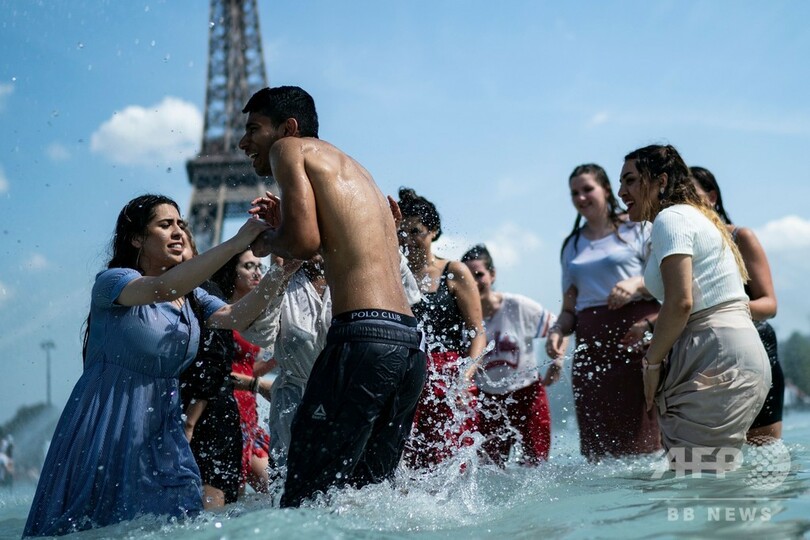 【6月26日 AFP】フランスは25日、例年より早い熱波の到来で猛暑に見舞われた。パリのエッフェル塔(Eiffel Tower)を望むトロカデロ(Trocadero)庭園では、暑さをしのごうとする人々が噴水に入って水遊びなどに興じた。