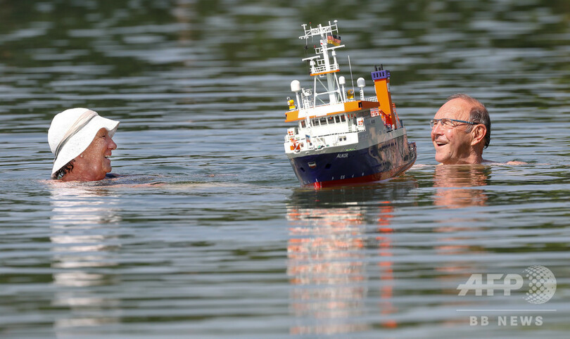 【7月14日 AFP】ドイツ南部エルティンゲン(Ertingen)のシュバルツァッハタル(Schwarzachtalsee)湖で、船の模型のそばを泳ぐ高齢のカップル。欧州では、熱波の到来で記録を更新する猛暑に見舞われている。(c)AFP