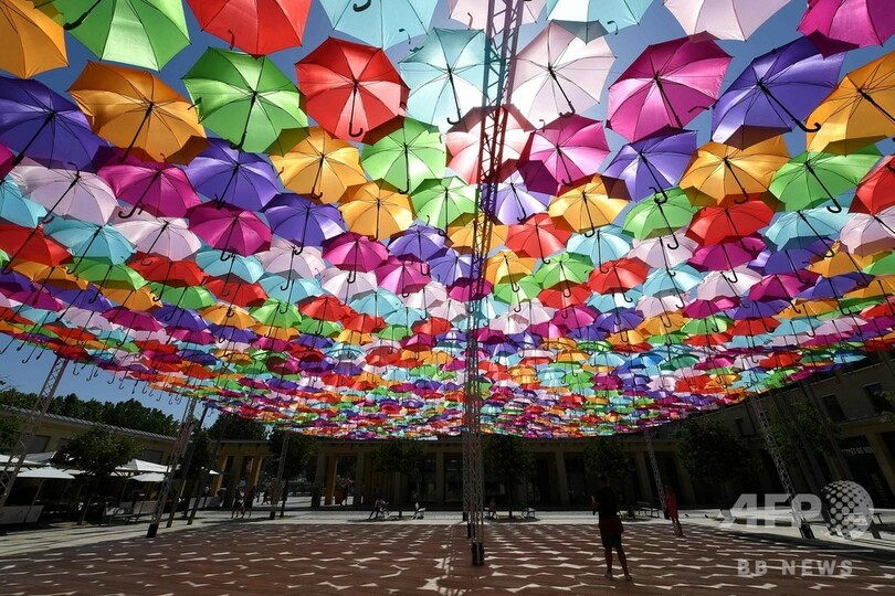 【7月1日 AFP】フランス南部エクサンプロバンス(Aix en Provence)に展示されているポルトガル人アーティスト、パトリシア・クーニャ(Patricia Cunha)さんが手掛けたインスタレーション「アンブレラスカイ・プロジェクト(Umbrella Sky Project)」。フランス観測史上初となる45度を超える気温が記録された先月28日には、傘の下で日差しを避ける人たちの姿が見られた。(c)AFP