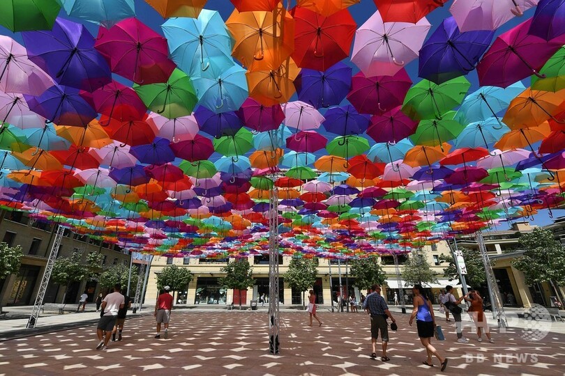【7月1日 AFP】フランス南部エクサンプロバンス(Aix en Provence)に展示されているポルトガル人アーティスト、パトリシア・クーニャ(Patricia Cunha)さんが手掛けたインスタレーション「アンブレラスカイ・プロジェクト(Umbrella Sky Project)」。フランス観測史上初となる45度を超える気温が記録された先月28日には、傘の下で日差しを避ける人たちの姿が見られた。(c)AFP