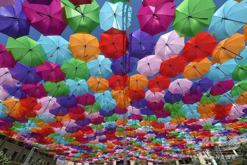 【7月1日 AFP】フランス南部エクサンプロバンス(Aix en Provence)に展示されているポルトガル人アーティスト、パトリシア・クーニャ(Patricia Cunha)さんが手掛けたインスタレーション「アンブレラスカイ・プロジェクト(Umbrella Sky Project)」。フランス観測史上初となる45度を超える気温が記録された先月28日には、傘の下で日差しを避ける人たちの姿が見られた。(c)AFP