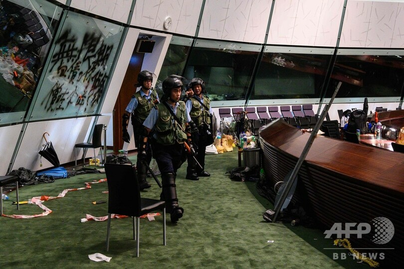 そうした中、英国による中国への香港返還から22年を迎えた1日には、民主派による大規模なデモが実施され、参加者らが林鄭長官の辞任を平和的に要求した。しかし同日夜になり、デモ隊の中でも若者が多い強硬派が怒りを爆発させ、立法会議事堂に突入。市章にスプレーで落書きをしたり、英統治時代の香港旗を掲げて「香港は中国ではない」と殴り書きしたりしたが、2日未明、警察当局によって強制排除された。