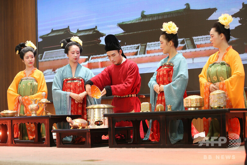 北京市や陝西省(Shaanxi)などから演技チーム19組、90人超が参加した。このうち10組が決勝に出場し、中国伝統の茶芸文化の精華を披露した。(c)CNS/JCM/AFPBB News