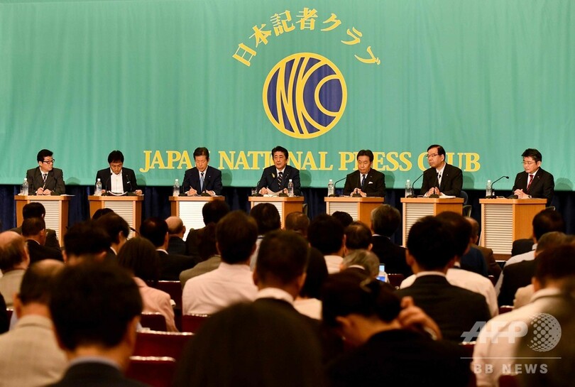 ニュース 政治・経済 主要7党、参院選に向け党首討論 日本記者クラブ 2019年7月3日 17:08 発信地:東京/東京 [ 日本 アジア・オセアニア ] このニュースをシェア ‹ › ❮ 7/7 ❯ 都内の日本記者クラブで行われた7党の党首らによる討論会。左から、日本維新の会の松井一郎代表、国民民主党の玉木雄一郎代表、公明党の山口那津男代表、自民党総裁の安倍晋三首相、立憲民主党の枝野幸男代表、共産党の志位和夫委員長、社民党の吉川元幹事長(2019年7月3日撮影)。(c)Toshifumi KITAMURA / AFP 画像作成中 ! 【7月3日 AFP】都内の日本記者クラブで3日、参院選に向けて主要7党の代表による党首討論会が開かれた。(c)AFP 政治・経済 一覧へ> メディア・報道関係・法人の方向け 写真・動画 購入のお問合せ>