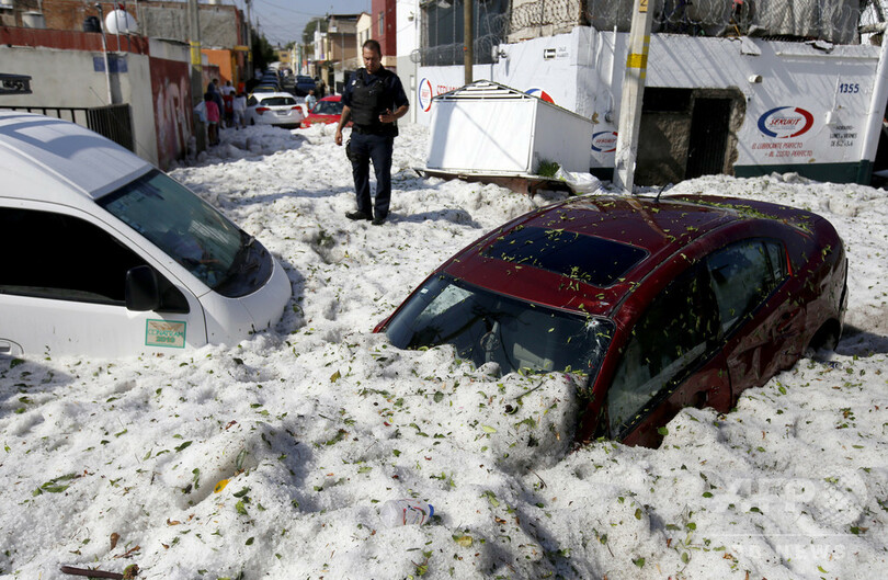 【7月12日 AFP】メキシコ・ハリスコ(Jalisco)州グアダラハラ(Guadalajara)東部で、ひょうに埋もれた車のかたわらに立つ警官。市内の通りにひょうが堆積し、車を埋めたり家屋を損傷したりした。(c)AFP