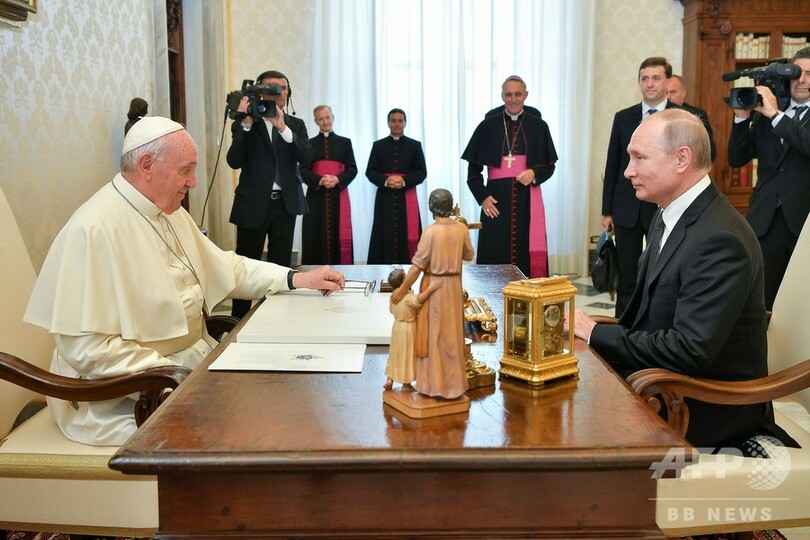 プーチン氏はバチカン市国で、フランシスコ法王と1時間近く非公開で会談した。5日にはウクライナのギリシャ・カトリック教会指導者らが法王の元を訪れる予定で、今回の会談はそれに先立ち行われたもの。ウクライナ東部では、ロシア正教信者を中心とする親ロシア派分離独立勢力が、正教とギリシャ・カトリックの信者からなる勢力と戦っている。