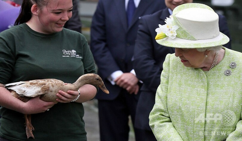 【7月5日 AFP】英国のエリザベス女王(Queen Elizabeth II)は4日、スコットランドのエディンバラにあるジョージ・シティ・ファーム(Gorgie City Farm)を訪れ、動物たちとの触れ合いを楽しんだ。雌ガモのオリーブの羽ばたきで歓迎される一幕も。(c)AFP