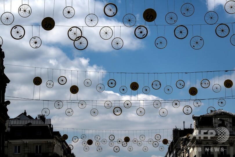 【7月17日 AFP】106回目を迎えるツール・ド・フランス(2019 Tour de France)開幕前に、自転車のホイールが針金につるされたベルギー・ブリュッセル中心部の通り。今大会は、総合首位のマイヨ・ジョーヌ(イエロージャージー)導入から100年、ベルギー人の伝説的選手エディ・メルクス(Eddy Merckx)が初制覇してから50年に当たる。(c)AFP
