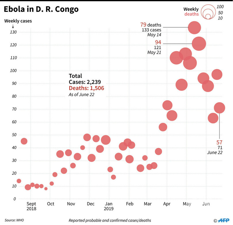 同省によると、4日までに確認された感染者は2382人に上り、うち1606人が死亡。また、同省報道官はAFPに対し、ウガンダ国境に接するイトゥリ(Ituri)州のアリワラ(Ariwara)で1日に感染が確認された患者が、その後に死亡したと述べた。