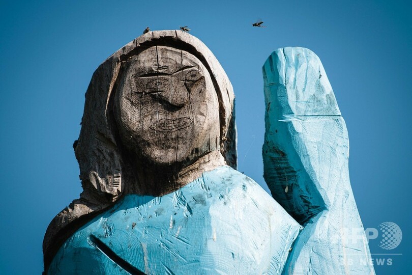 像は木をチェーンソーで削り出したもので、青い服を着て、左手を振るメラニア夫人を表現している。夫人は2017年、ドナルド・トランプ(Donald Trump)米大統領の就任式で同じしぐさをしていた。