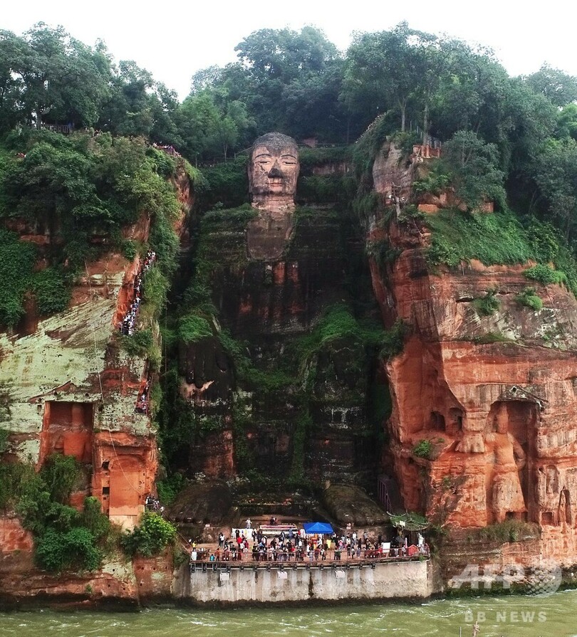 中国四川省(Sichuan)楽山市(Leshan)にある「楽山大仏(Leshan Giant Buddha)」は、唐の時代の開元元年(713年)に造られ、1300年を超える歴史がある。世界で最も大きな石刻弥勒菩薩(みろくぼさつ)の座像で、国連教育科学文化機関(UNESCO、ユネスコ)の世界遺産(World Heritage)にも登録されている。