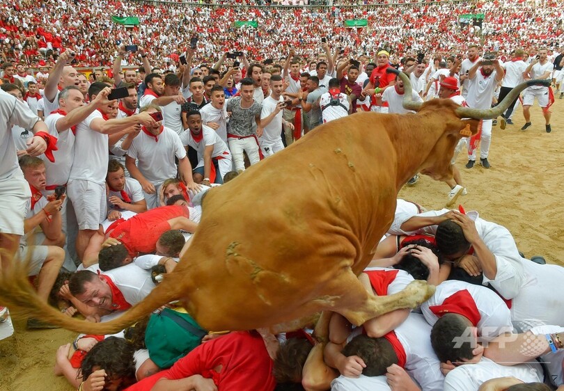 【7月8日 AFP】スペイン北部ナバーラ(Navarra)州パンプロナ(Pamplona)で8日、「サン・フェルミン祭(San Fermin Festival)」名物の牛追いが2日目を迎えた。