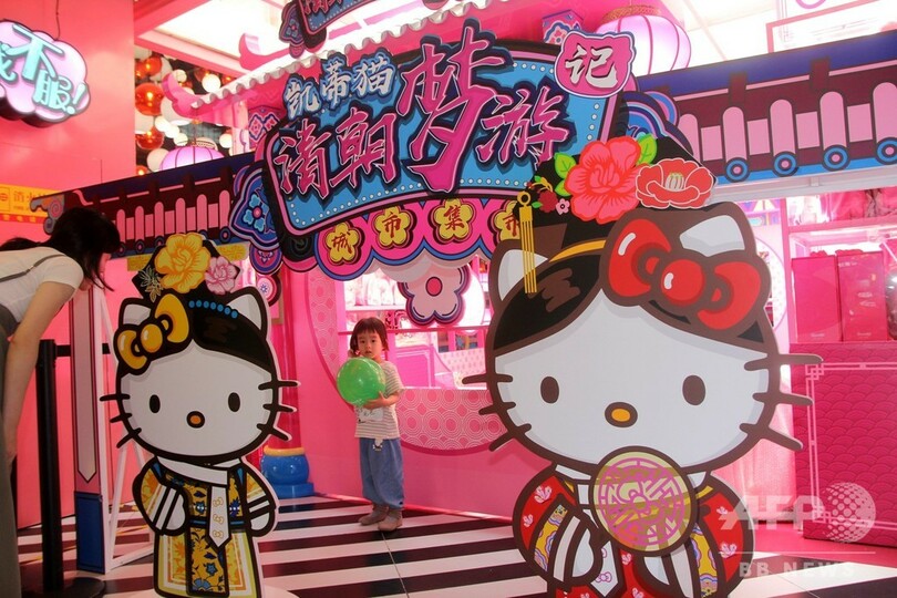 ハローキティは登場から45年が経つが、今でも世界でトップクラスのキャラクターだ。中国服を身に着けたハローキティが、清朝のお姫様のコスプレイヤ―と共に、時空を超え、清朝の宮廷へ客を案内。客らは、現在と過去が不思議に織り交ざった体験を楽しんでいた。(c)CNS/JCM/AFPBB News