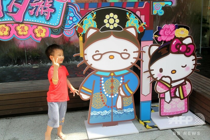 ハローキティは登場から45年が経つが、今でも世界でトップクラスのキャラクターだ。中国服を身に着けたハローキティが、清朝のお姫様のコスプレイヤ―と共に、時空を超え、清朝の宮廷へ客を案内。客らは、現在と過去が不思議に織り交ざった体験を楽しんでいた。(c)CNS/JCM/AFPBB News