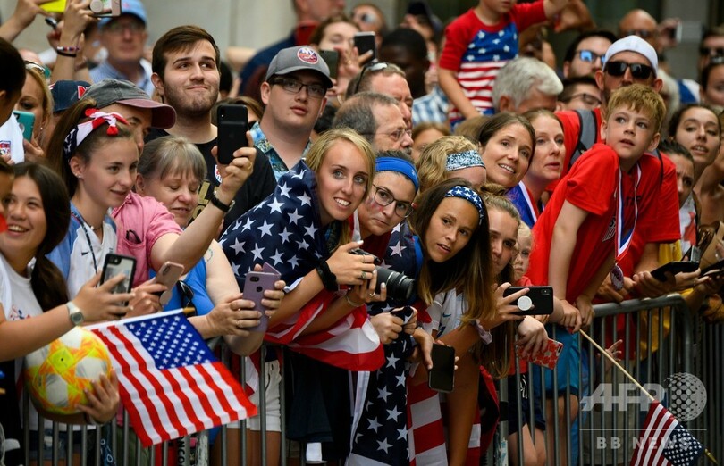 【7月11日 AFP】女子サッカーW杯フランス大会(FIFA Women's World Cup 2019)を制した米国代表が10日、ニューヨークで凱旋(がいせん)パレードを行い、数万人のファンから祝福を受けた。紙吹雪が舞う中、「平等な賃金」や「USA」といったコールが鳴り響いた。