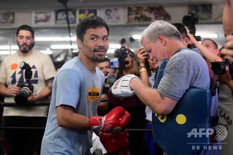 現在40歳のパッキャオは、20日に米ラスベガス(Las Vegas)のMGMグランド・ガーデン・アリーナ(MGM Grand Garden Arena)で無敗のサーマンと対戦する。(c)AFP/Rob Woollard