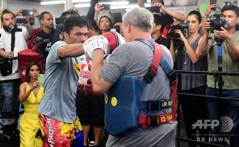 現在40歳のパッキャオは、20日に米ラスベガス(Las Vegas)のMGMグランド・ガーデン・アリーナ(MGM Grand Garden Arena)で無敗のサーマンと対戦する。(c)AFP/Rob Woollard