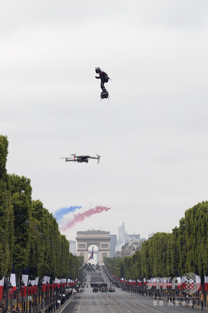 パレードではその他、仏発明家・起業家のフランキー・ザパタ(Franky Zapata)氏の未来的な「フライボード」が披露され、シャンゼリゼ通りに集まった人々と首脳陣の上を高々と舞い上がった。マクロン氏は国営放送フランス2(France 2)で、「軍は変化しつつある。わが国の兵士と主権、そして独立のため近代化を進めている」と述べた。(c)AFP/Daphné BENOIT and Stuart WILLIAMS