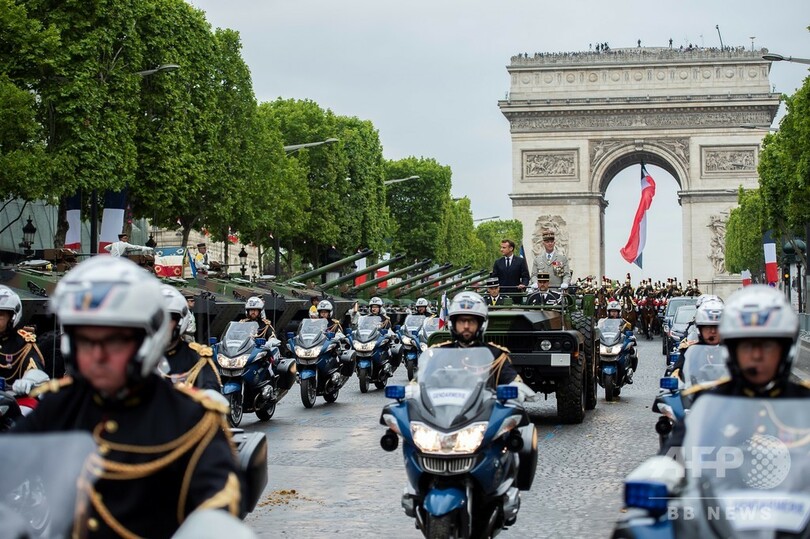仏、革命記念日パレードで欧州の軍事協力誇示 終了後には抗議デモも