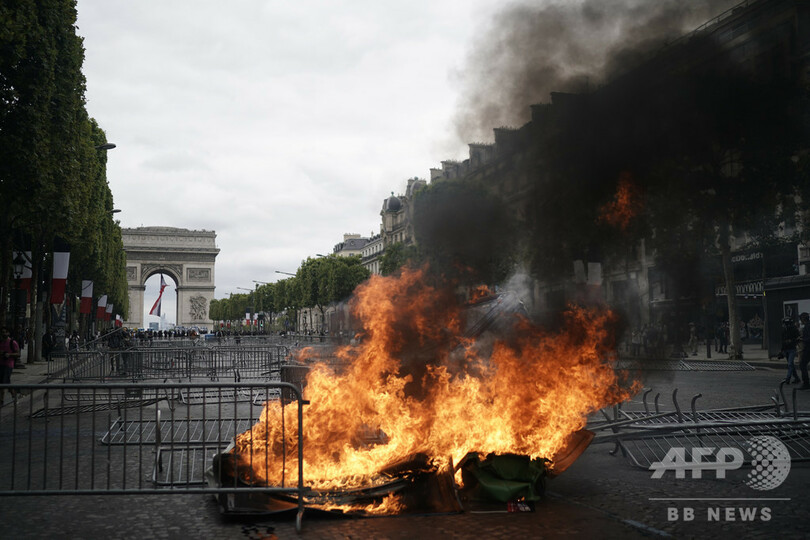 だが式典の後には抗議デモが発生しデモ参加者と警察が衝突した。パレードの観衆と外国人観光客が避難する中、警察はシャンゼリゼ(Champs-Elysees)通りからデモ隊を排除するため催涙ガスを放った。デモ隊は防護壁を壊し、通りのごみ箱や簡易トイレに放火。「マクロンは辞めろ」などと反政府スローガンを唱和した。当局によると、日中計175人が拘束された。