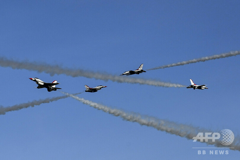 【7月15日 AFP】南米コロンビア・アンティオキア(Antioquia)州リオネグロ(Rionegro)で13日、コロンビア空軍創設100周年を記念した式典が行われ、米空軍のアクロバット飛行チーム「サンダーバーズ(Thunderbirds)」が華麗な技を披露した。(c)AFP