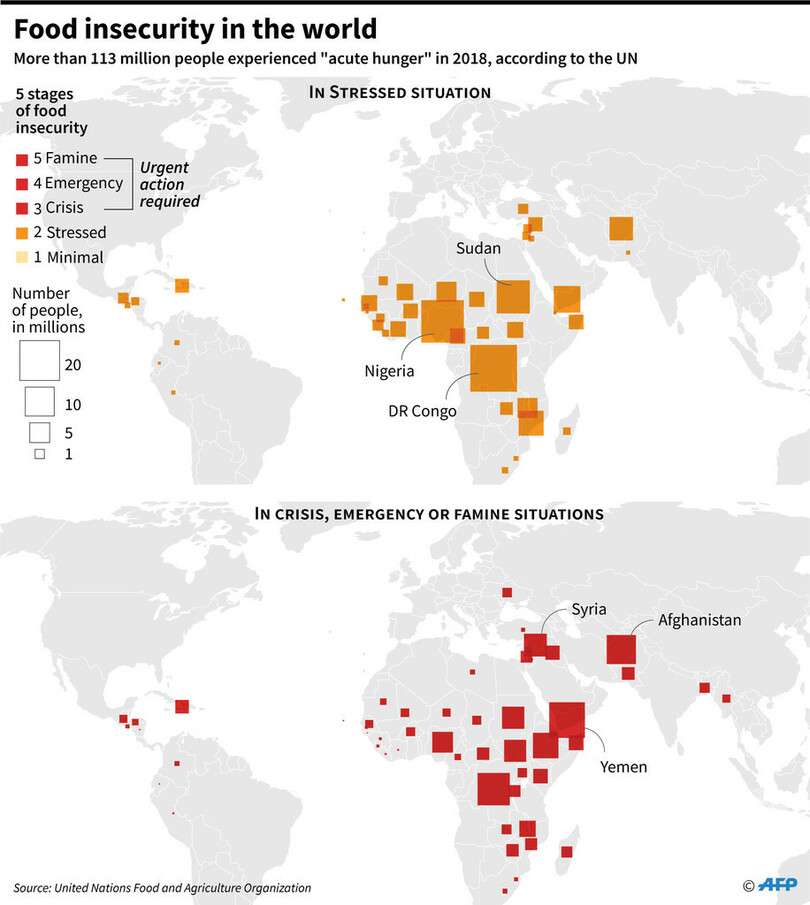 【7月16日 AFP】2018年に飢餓状態にあった人は世界で8億2100万を超え、3年連続で増加した。国連の食糧農業機関(FAO)と世界保健機関(WHO)が15日、共同報告「世界の食料安全保障と栄養の現状(The State of Food Security and Nutrition in the World)」で明らかにした。