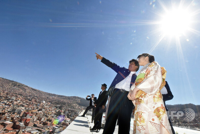 【7月16日 AFP】ボリビアを訪問中の秋篠宮家の長女眞子さまは15日、同国の事実上の首都ラパスにある大統領府を訪れ、屋上のヘリポートからエボ・モラレス(Evo Morales)大統領とともに市内の景色を眺められた。