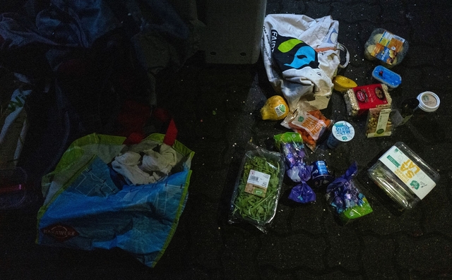 戦利品を運ぶため容量60リットルのバックパックを持ってきていたアンドレアは、自分はビーガンのため肉や乳製品は持ち帰ったことがないと話した。ごみ箱の中には彼が望む物が十分過ぎるほど入っていた。
