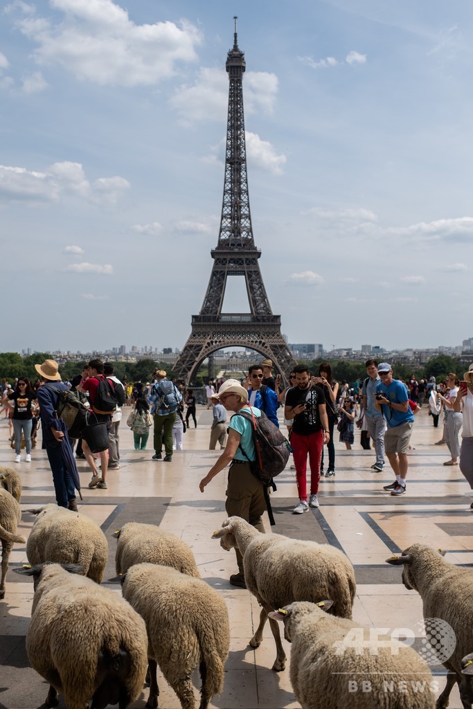 【7月18日 AFP】フランス・パリ北郊を6日に出発した25匹の羊の群れが17日、パリ中心部トロカデロ(Trocadero)庭園近くのセーヌ(Seine)川のほとりで、約140キロの旅を終えた。歴史的建造物や住宅の周囲に生えた草を食べながら、12日間かけて市内を練り歩いた。