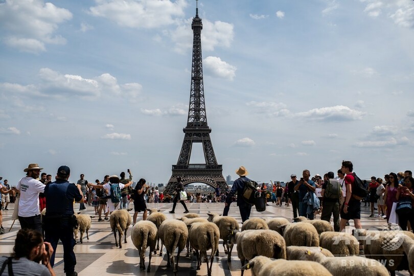 【7月18日 AFP】フランス・パリ北郊を6日に出発した25匹の羊の群れが17日、パリ中心部トロカデロ(Trocadero)庭園近くのセーヌ(Seine)川のほとりで、約140キロの旅を終えた。歴史的建造物や住宅の周囲に生えた草を食べながら、12日間かけて市内を練り歩いた。