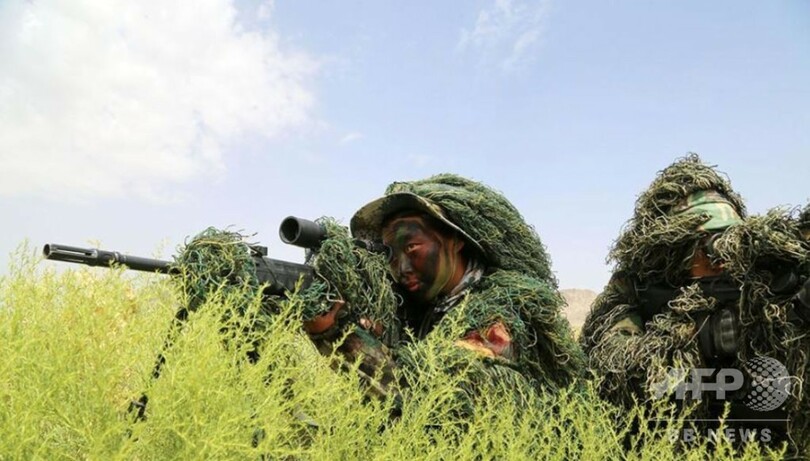 重さ30キロのリュックサックを背負いながら20キロの距離を行軍し、ターゲットの識別や、周囲の草木と一体となるカムフラージュ、素早く穴を掘る訓練などに取り組んだ。各チームは男女を問わず、厳格かつ困難な訓練に挑戦して作戦能力を高めた。(c)CNS/JCM/AFPBB News